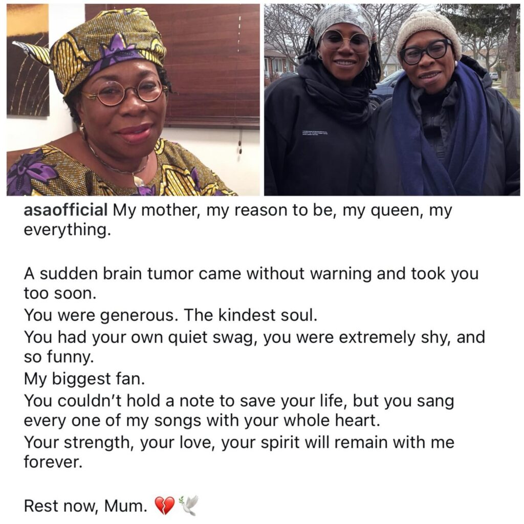 Popular Nigerian singer Asa, has announced the death of her mother following a battle with a brain tumour.