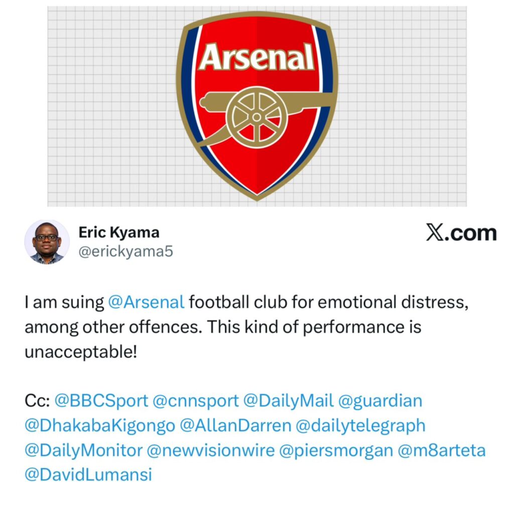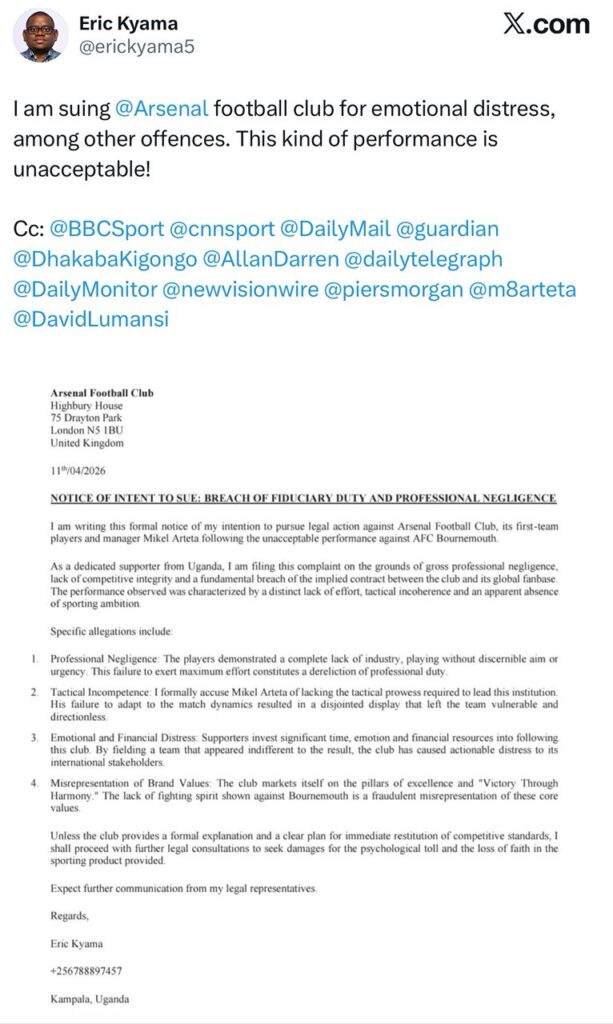 An Arsenal supporter in Uganda has officially informed the club of plans to pursue legal action, alleging professional negligence, poor tactical decisions, and emotional distress.